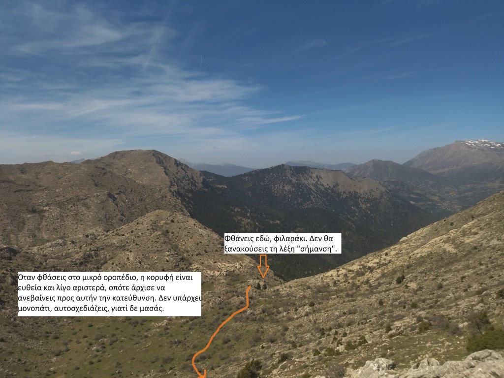 Προσοχή, αλάνια: Μετά το μικρό οροπέδιο (περίπου 1.500 μέτρα) που φαίνεται και στις παρακάτω φωτογραφίες, δεν υπάρχει σήμανση και καθαρό μονοπάτι πουθενά. Εσείς οι ορειβατικοί σύλλογοι της Κορινθίας, you had one job! Η σήμανση σε Ζήρεια και Γεράνεια να είναι απλά φτωχή, αλλά εδώ δεν μπήκατε καν στον κόπο. Πείτε τουλάχιστον σε εμάς να το κάνουμε, ρε παίδες.